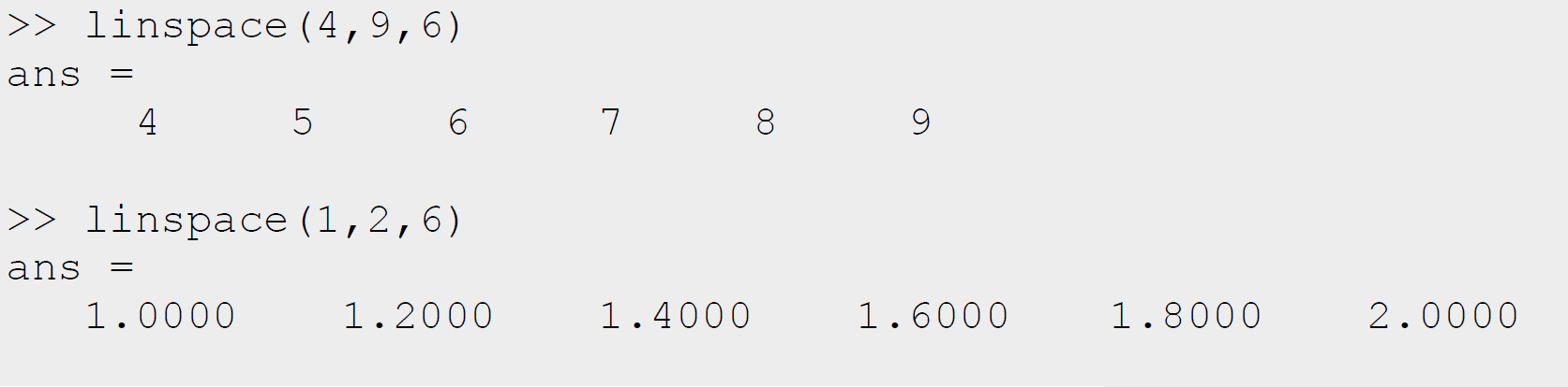 ()linspace: اگر بخواهیم بازهای دلخواه را به صورت خطی به چندین قسمت مساوی تقسیم کنیم از این تابع استفاده میکنیم و فرم فراخوانی آن بهصورت (linspace(a,b,N میباشد که در نتیجه آن یک بردار سطری با عنصر اول a و عنصر آخر b، فاصله عناصر یکسان و طول بردار N خواهیم داشت.