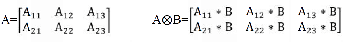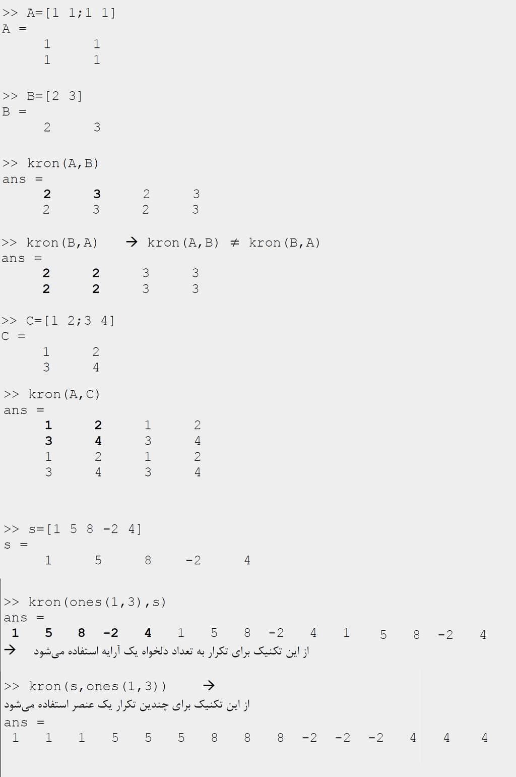 (kron(ones(n,m),A ماتریس A را در n سطر m ستون تکرار میکند و معادل (repmat(A,n,m است.