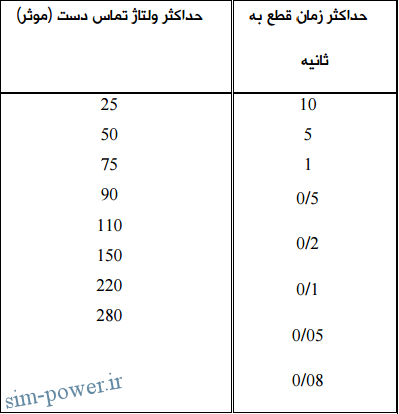 فاز به هادي حفاظتی، قطع مدار هر چه سریعتر مطابق جدول شماره زیر انجام پذیرد.