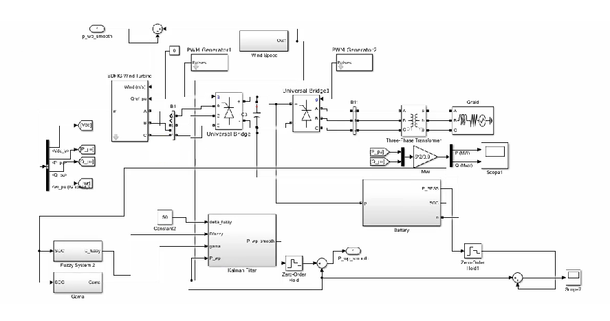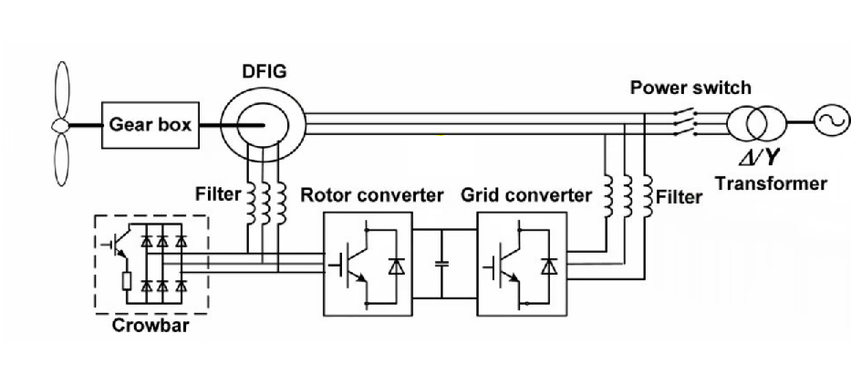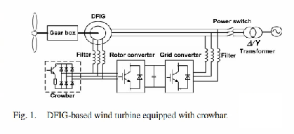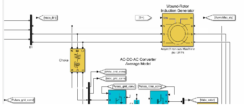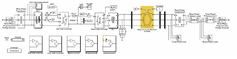 اول DFIG استفاده شده است که ما بجای این از یک VDFIGاستفاده کرده ایم. سیستم های Router converter و Grid Converter که سمت روتر دستگاه و سمت شبکه را از هم جدا می کند . دلیل وجود اینگونه سیستم ها همانگونه که توضیح داده شده این است که اینگونه سیستم ها به ما کمک می کنند تا با ثابت نگه داشتن لینک DC که در شبیه سازی ماهم به وضوح انجام شده بتوانیم کنترل دقیقی را روی کل این شبکه و فرکانس شبکه داشته باشیم که پارامتر بسیار مهمی است . بعد از آن یک سیستمی است که ما را با یک ترانسفورمر به شبکه اصلی مان متصل می کند که ما همه این ها را در شبیه سازی مان پیش بینی کرده ایم.