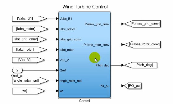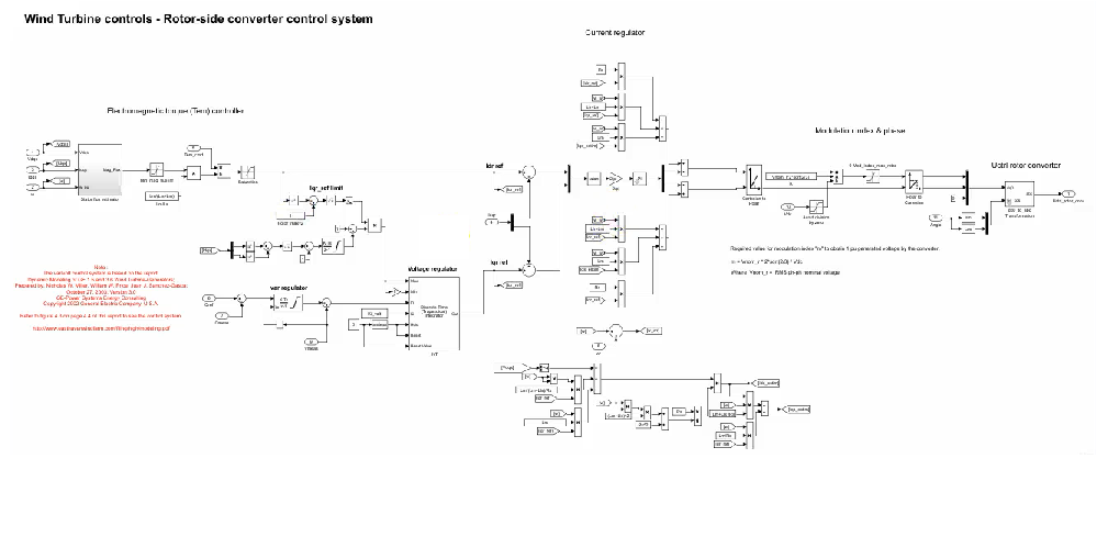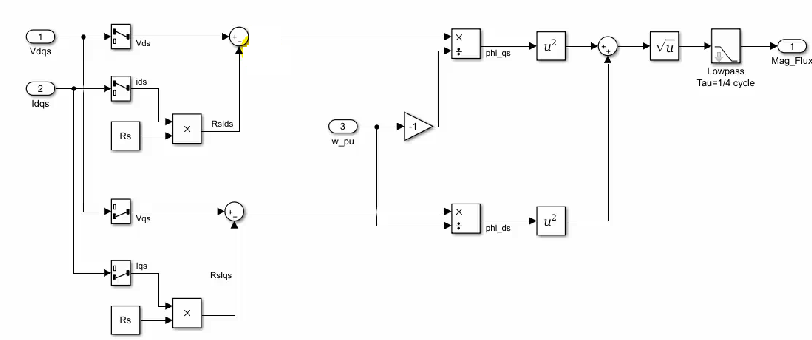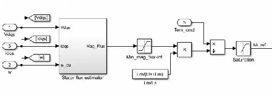 اول ولتاژ dqs ، جریانidqs سمت اسلاتور که در این قسمت مشاهده می کنید .و سوم میزان چرخش بر حسب per/unit وارد این estimator می شود و بعد از گذاشتن در فورمول تخمینی از میزان شار را دارد . بعد از آن میزان شار را محدود می کنند ( جاهایی که شار بهه اشباع می رود را در نظر نمی گیرند) و ناحیه خطی آن را برای محاسبات کنترلی در نظر می گیرند و میزان اندوکتانس سیم پیچ ها می کنند و با یک سری محاسبات id reference سمت روتر (idr ) را محاسبه می کنند و در نهایت از اینطرف نیز با یک ولتاژ regulation ما مواجه هستیم که برای ما ولتاژ را regulate می کند و iq reference را می دهد و در نهایت وارد ti می شود (عین connection های مربوط به سمت شبکه که توضیح داده شد).
