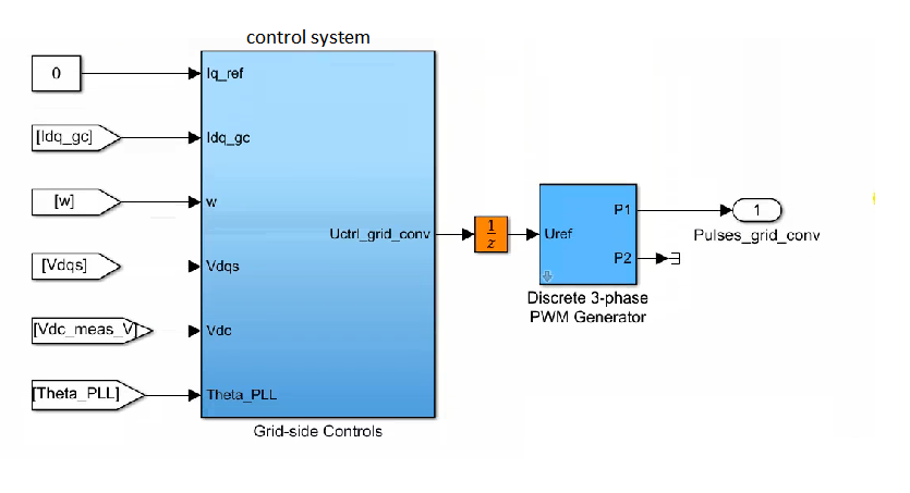 و vdc هم فقط برای اینکه اگر زمانی ولتاژ dc ما صفر شد avoid division by zeroدر اینجا می گذاریم که اگر چنانچه ولتاژdc ما صفر شد(چون می خواهیم آن را در مخرج بگذاریم) مانع از صفر شدن آن شود. بعد از آن وارد مرجله آخر می شویم که باید سیستم dq به abc ما تبدیل شود این کار را انجام می دهیم و در نهایت grade side converter control system ما که یک controller پیچیده، عمیق و در عین حال کاملا منطبق بر مبانی علمی است تشکیل می شود و سمت grade ما به این نحو کنترل می شود . سپس خروجی وارد یک pwm generator می شود که با استفاده از سه مرجعی که به آن داده می شود به عنوان رفرنس می آید و پالس ها را برای ما تشکیل می دهد . البته چون pwm controller برای سیستم 12 تایی آمده است و ساختارش برای آن انجام شده نیاز است که ما از یک leg on استفاده کنیم تا پالس ها به تعداد کافی برای ما ایجاد شوند.