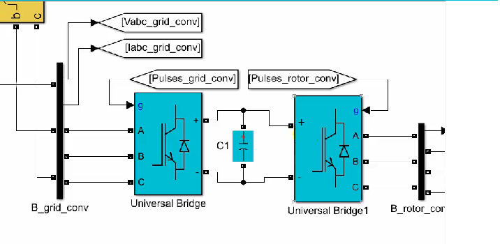 وبعد از آن یک ترانس قرار داده ایم و دو universal bridge را به صورت پشت به پشت در این قسمت قرار داده ایم که مشابه همان کاری است که خود مقاله انجام داده است . یک سری subsystem هایی را مقاله گذاشته است که 3-4 عدد آنها برای اندازه گیری است و controller های سمت aerator و controller سمت grade است که ما آنها را تصحیح کرده ایم به این جهت که می بایست ما از مدل bdfig استفاده می کردیم، مدلی که ما قبلا نوشته شده بود و ما از Matlab function آن استفاده کردیم. یک سری ورودی هایی دارد که به عنوان مثال VDI ,VQR, و ولتاژهای D,Q که خود مقاله نیز به آنها اشاره کرده است . ما باید سیستم abc مان را به d,q تبدیل کنیم که این کار انجام شده است. و به عنوان خروجیمان ، خروجی جریان ، خروجی d,q، خروجی گشتاور را داریم که اینها را بعنوان خروجی controller مان از آنها استفاده کردیم.